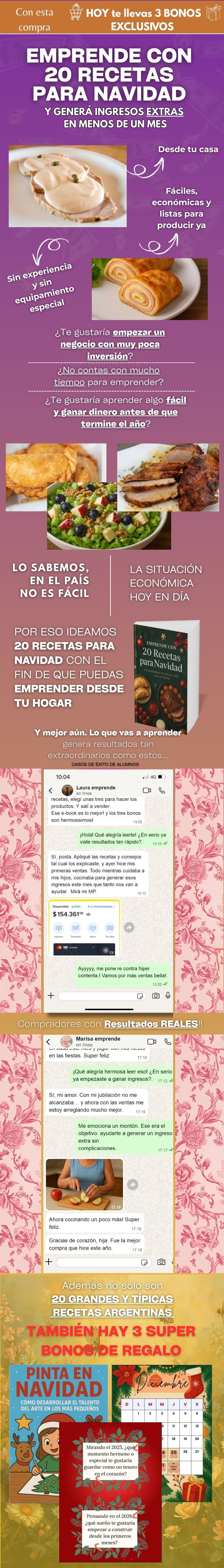 "Tengo un pequeño emprendimiento y siempre busco productos que me ayuden a crecer. 20 Recetas para Emprender en Navidad fue una joyita: súper práctico, visual, moderno y muy económico para todo el valor que aporta. Me permitió mejorar mis recetas y lanzar una nueva línea navideña que mis clientes adoraron. Es una herramienta ideal para emprendedoras que quieren destacarse."